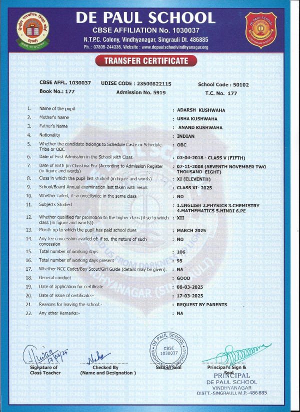 Transfer Certificate of ADARSH KUSHWAHA 5919