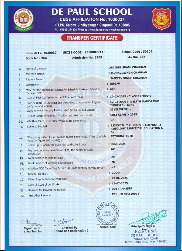 Transfer Certificate of ADITREE SINGH CHAUHAN 5208