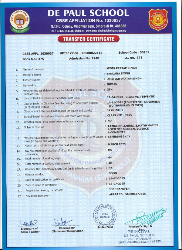 Transfer Certificate of ADVIK PRATAP SINGH 7248