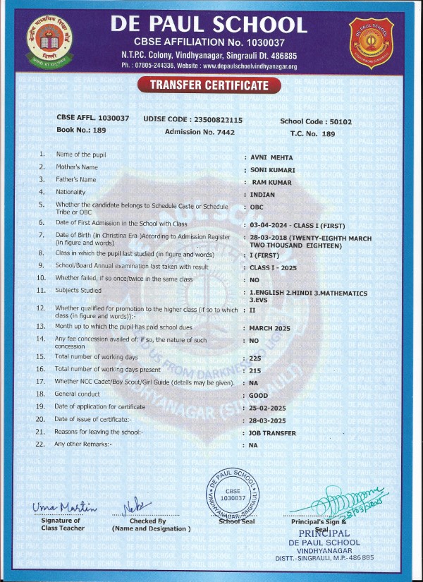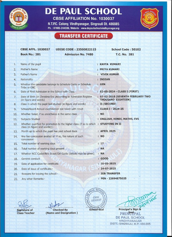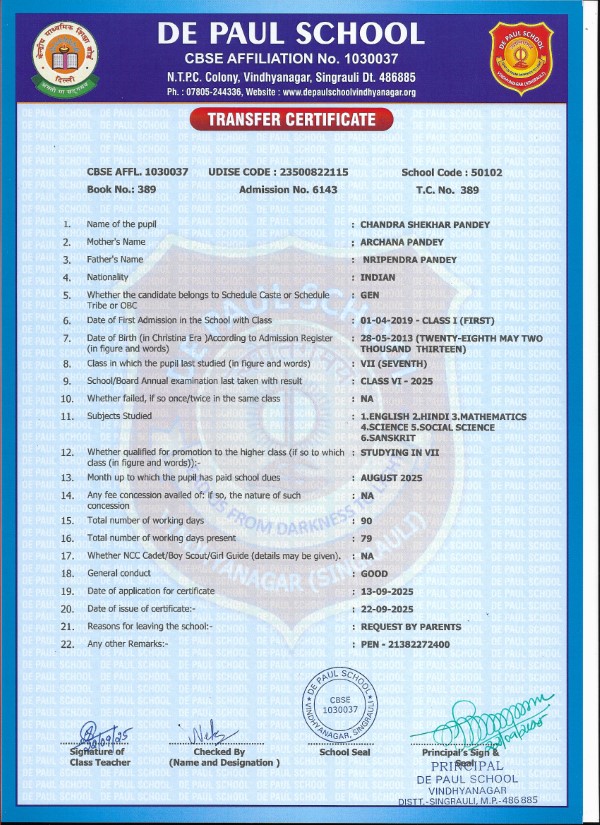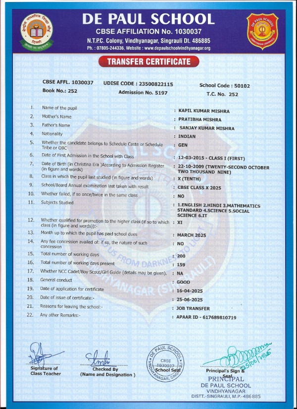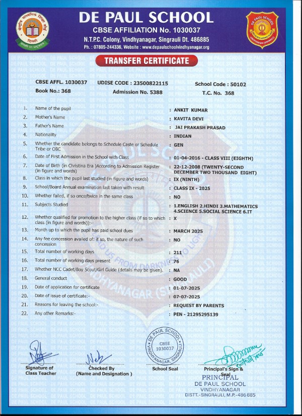 Transfer Certificate of VIKASH VISHWAKARMA 7309