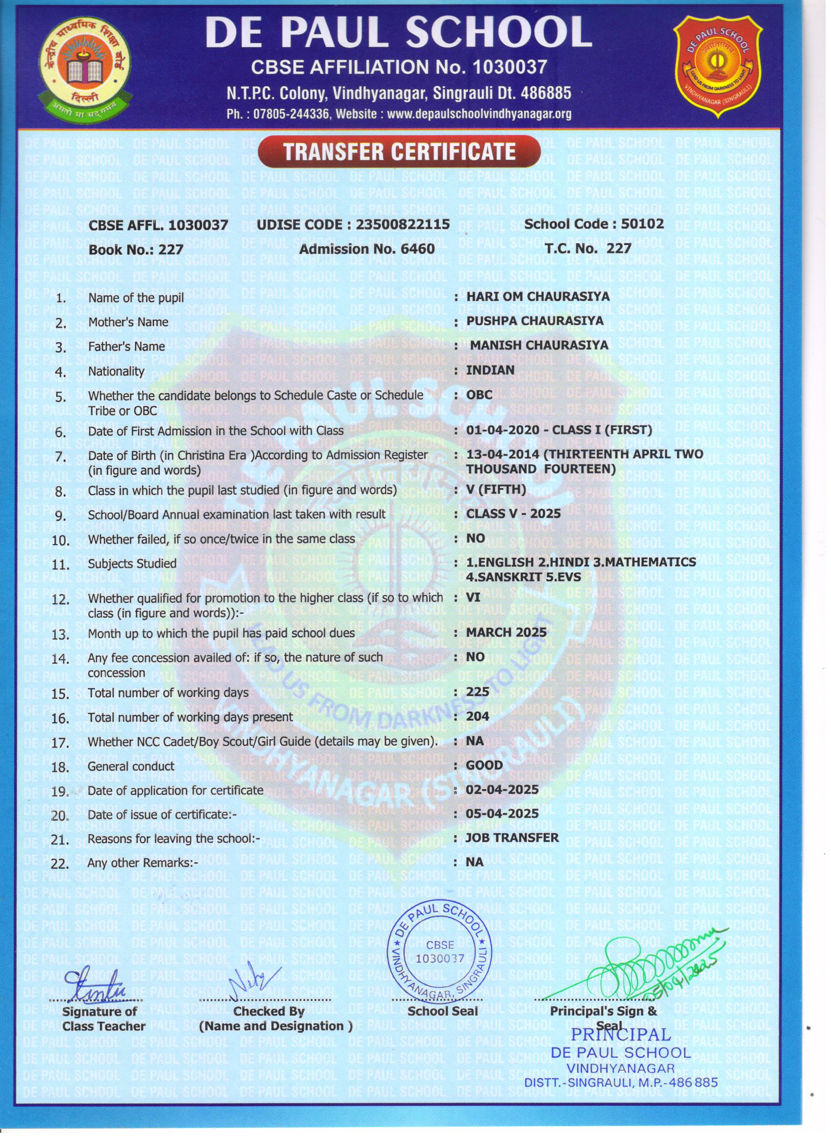 Transfer Certificate of HARI OM CHAURASIYA 6460