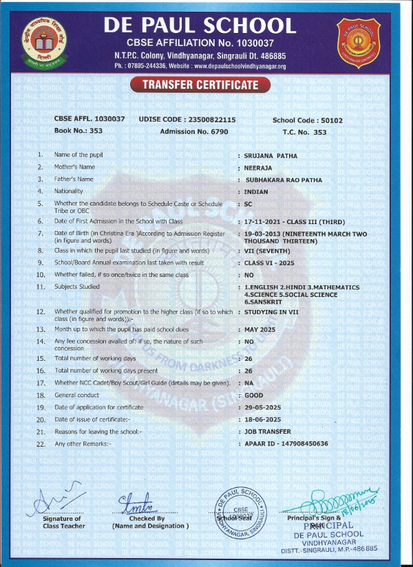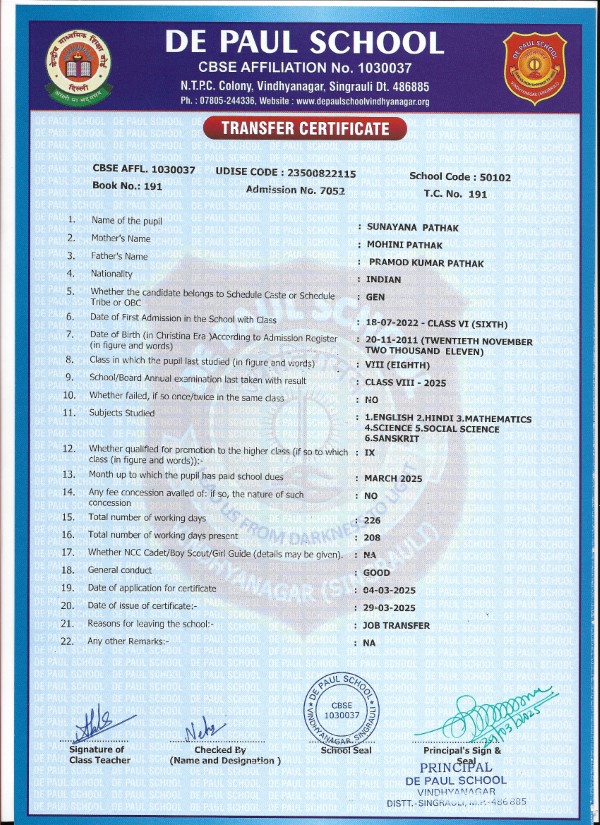 Transfer Certificate of ANANYA TRIPATHI 6768