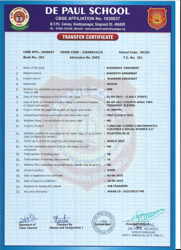 Transfer Certificate of VAISHNAVI SARASWAT 5653