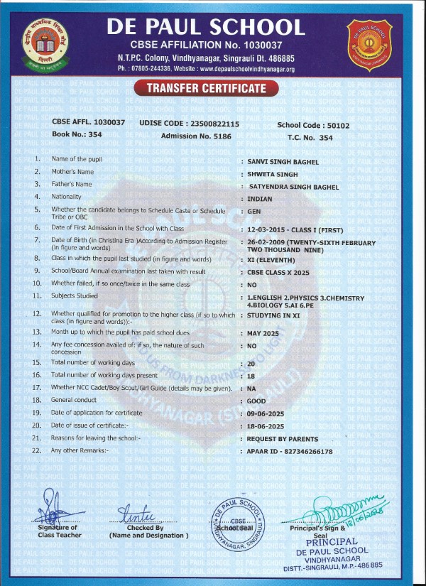 Transfer Certificate of 5186 SANVI SINGH BAGHEL