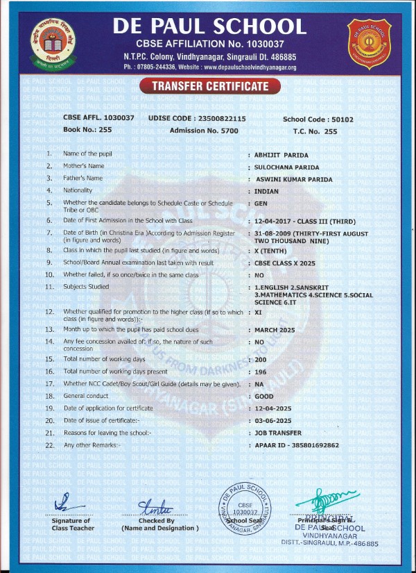 Transfer Certificate of ABHIJIT PARIDA 5700