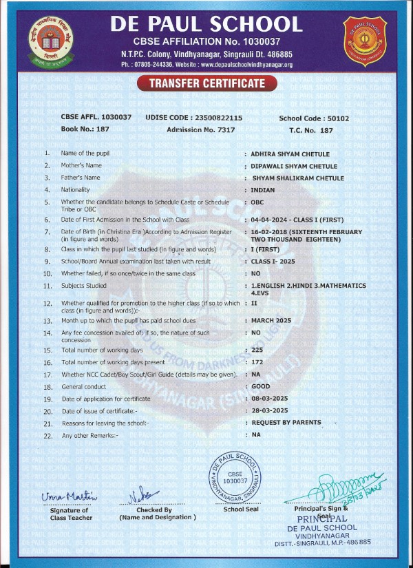 Transfer Certificate of ADHIRA SHYAM CHETULE