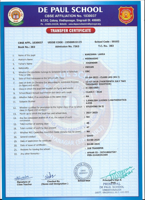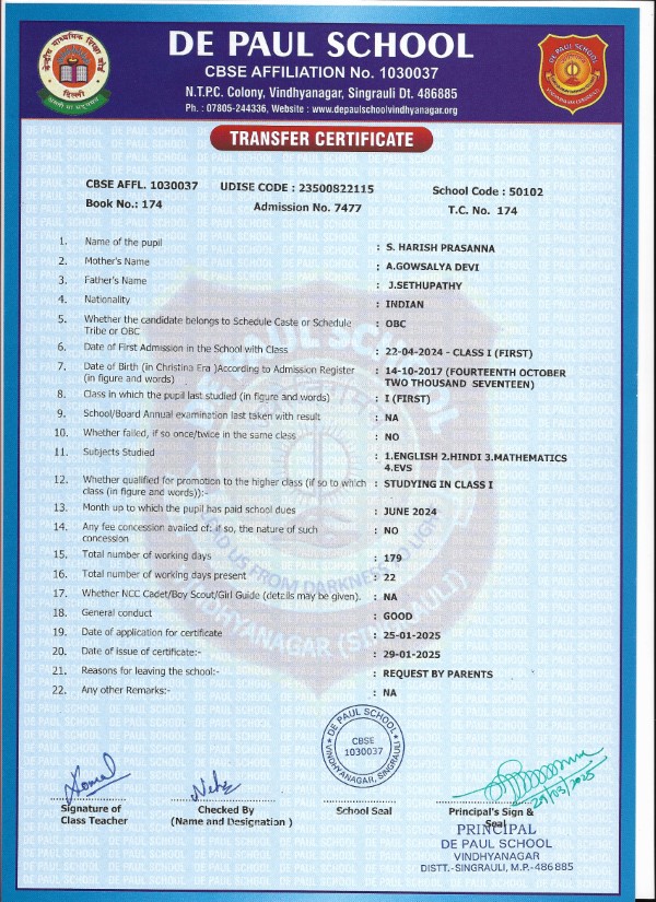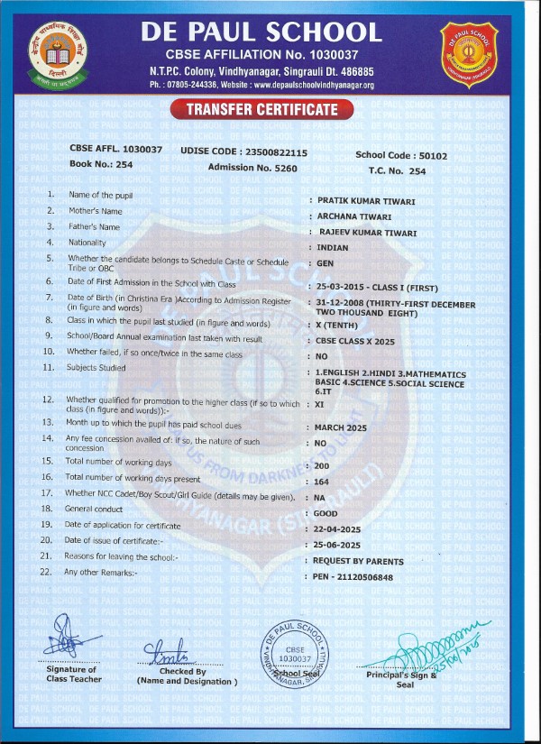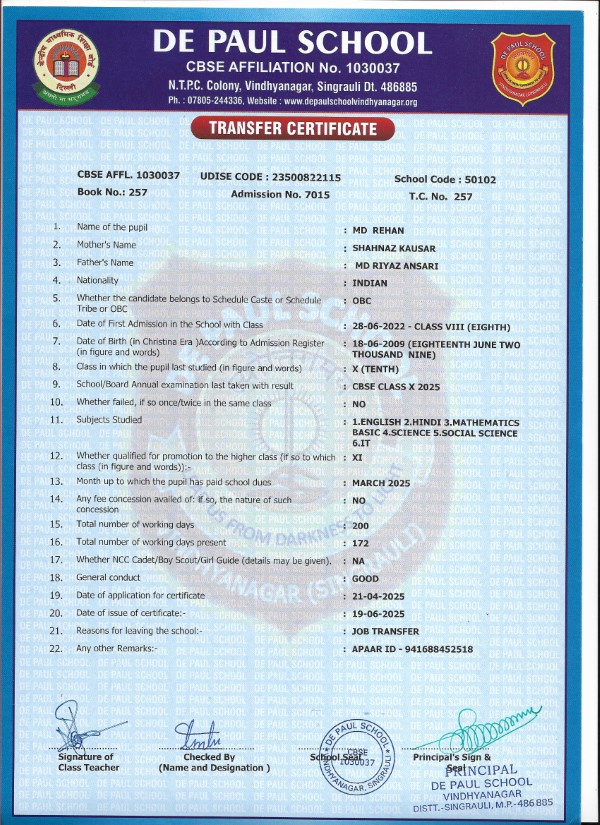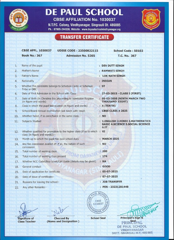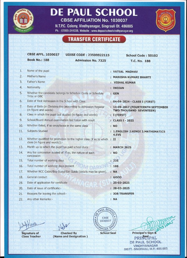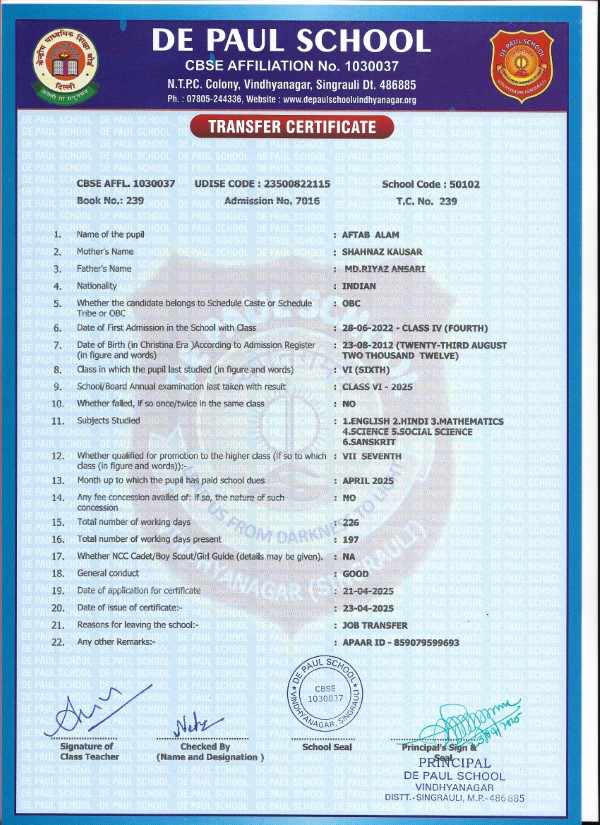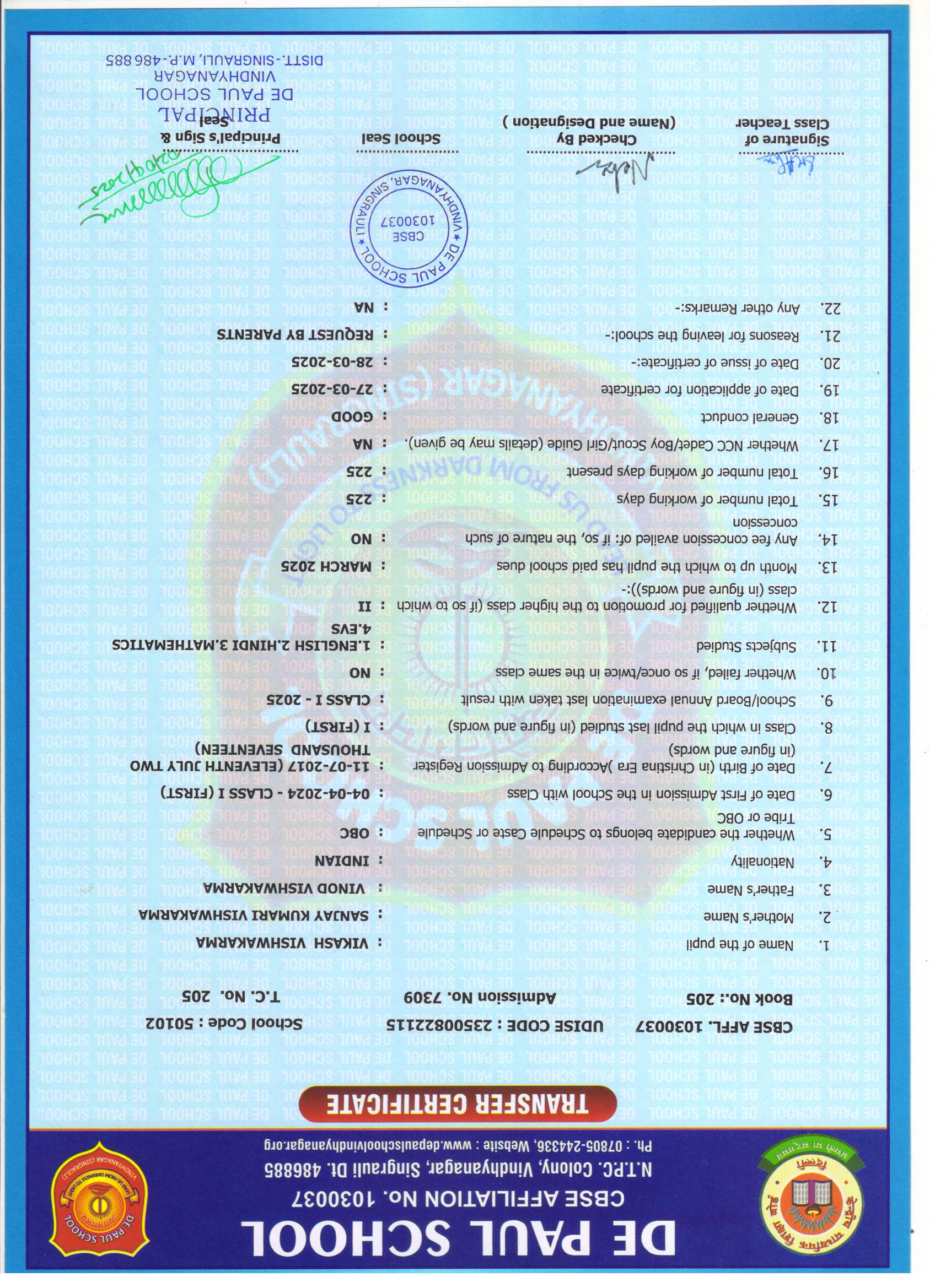 Transfer Certificate of VIKASH VISHWAKARMA 7309