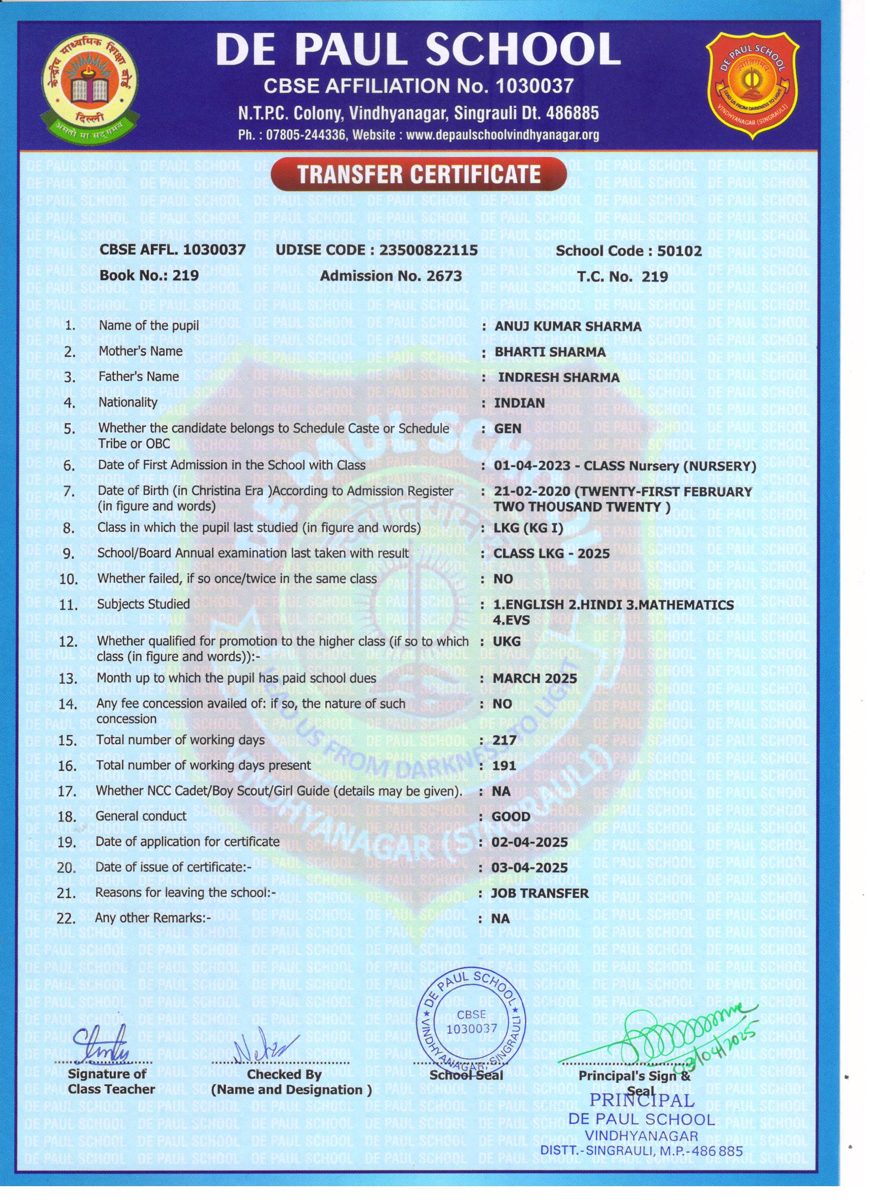 Transfer Certificate of ANUJ KUMAR SHARMA 2673