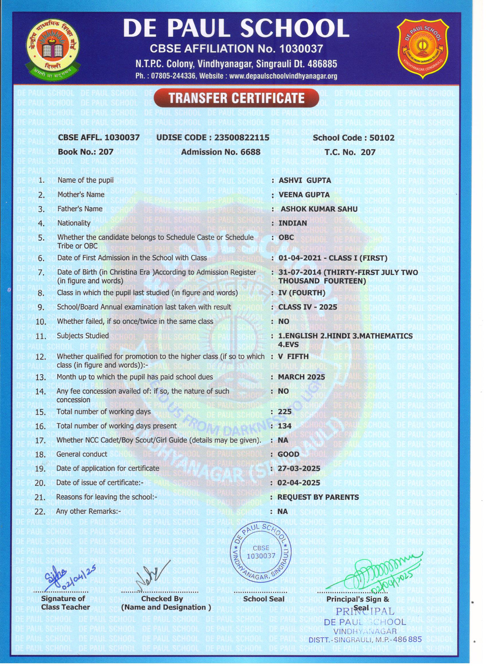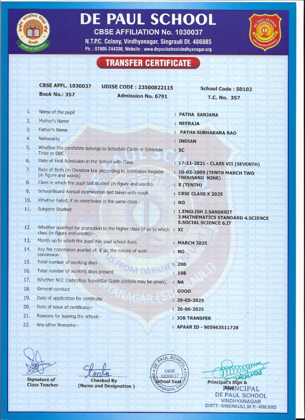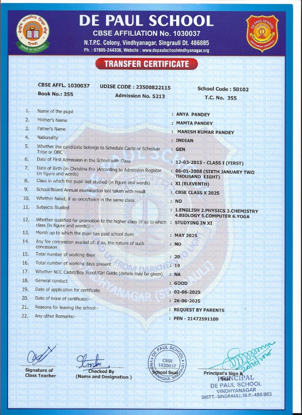 Transfer Certificate of ANANYA TRIPATHI 6768