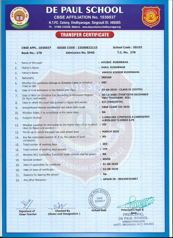 Transfer Certificate of AYUSHI KUSHWAHA 5940