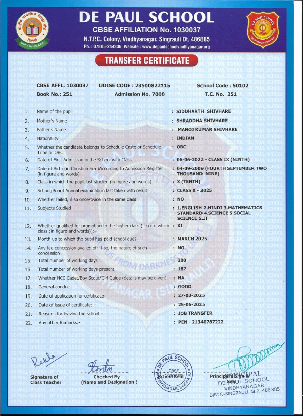 Transfer Certificate of SIDDHARTH SHIVHARE 7000